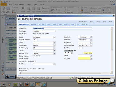 TrackerSuite.Net is a 100% Web based solution that can be surfaced in Microsoft Outlook. It includes a project management module that allows managers to configure project tasks in Outlook, as well as simplifying their assignment, management and tracking. Assignees can easily review scheduled work in Outlook task lists and calendars.